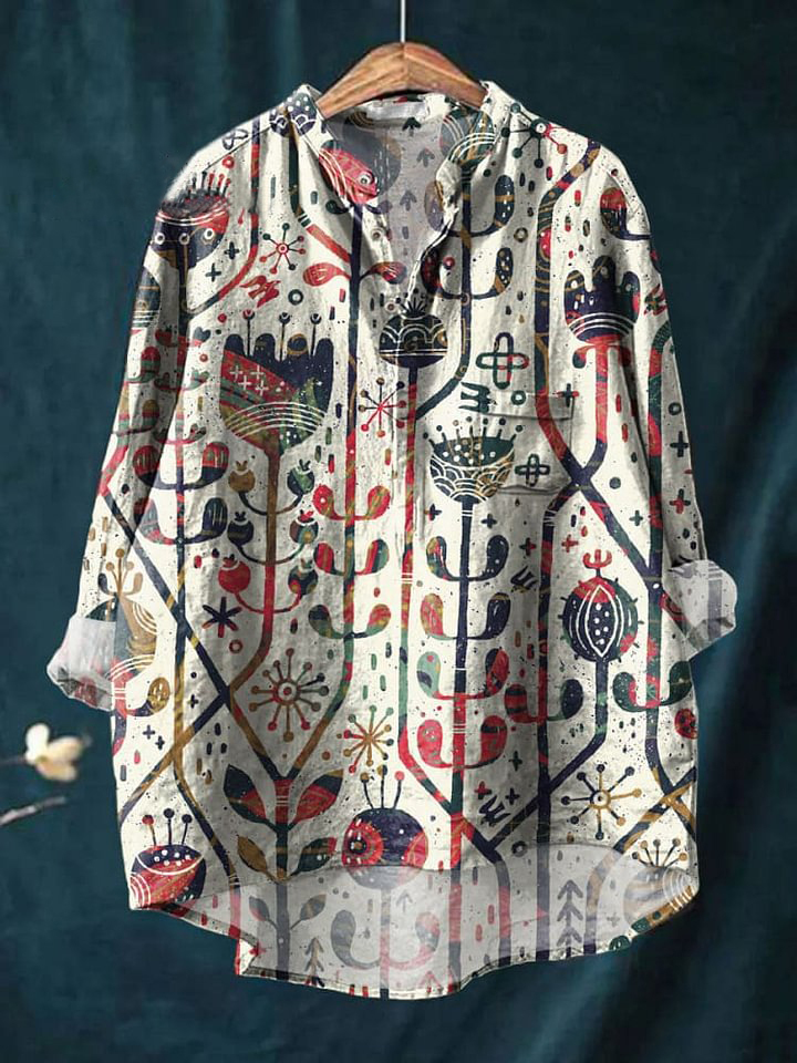 Women's Vintage Abstract Flower Art Print Casual Long Sleeve Comfortable Cotton Shirt
