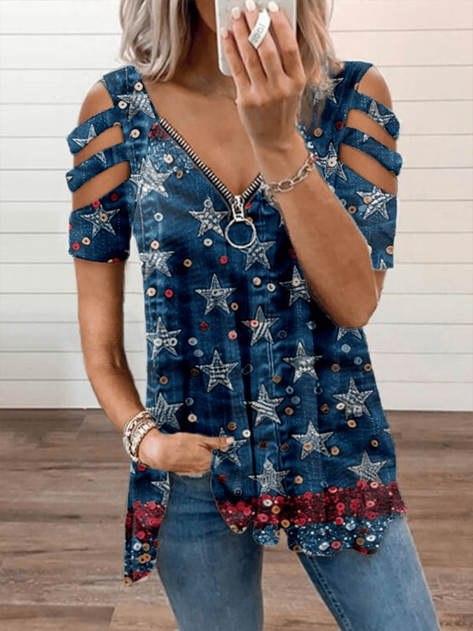 Women's Vintage American Flag Print Zipper Off Shoulder Casual T-Shirt