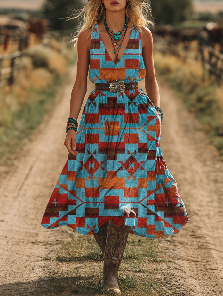 Women's Vintage Aztec Print Sleeveless Cotton and Linen Pocket Dress