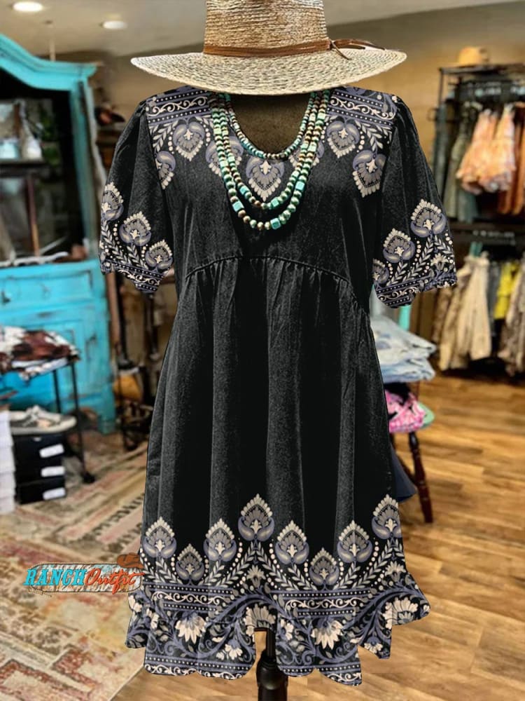 Women's Vintage Black Print Pocket Cotton Dress