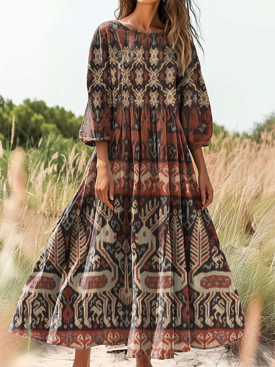 Women's Vintage Bohemian Floral Art Print Flowy Cotton Crew Neck Dress