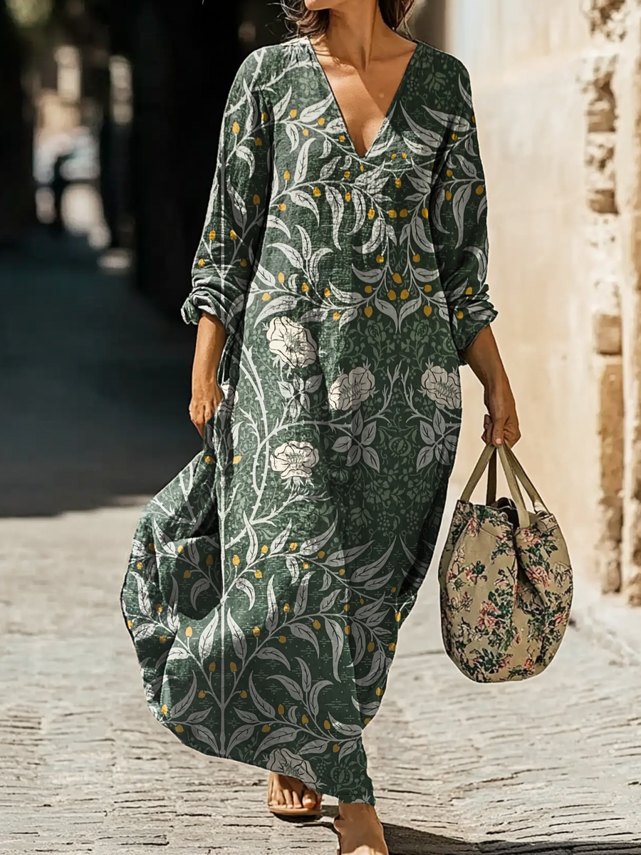 Women's Vintage Botanical Art Print Pocket Cotton Dress