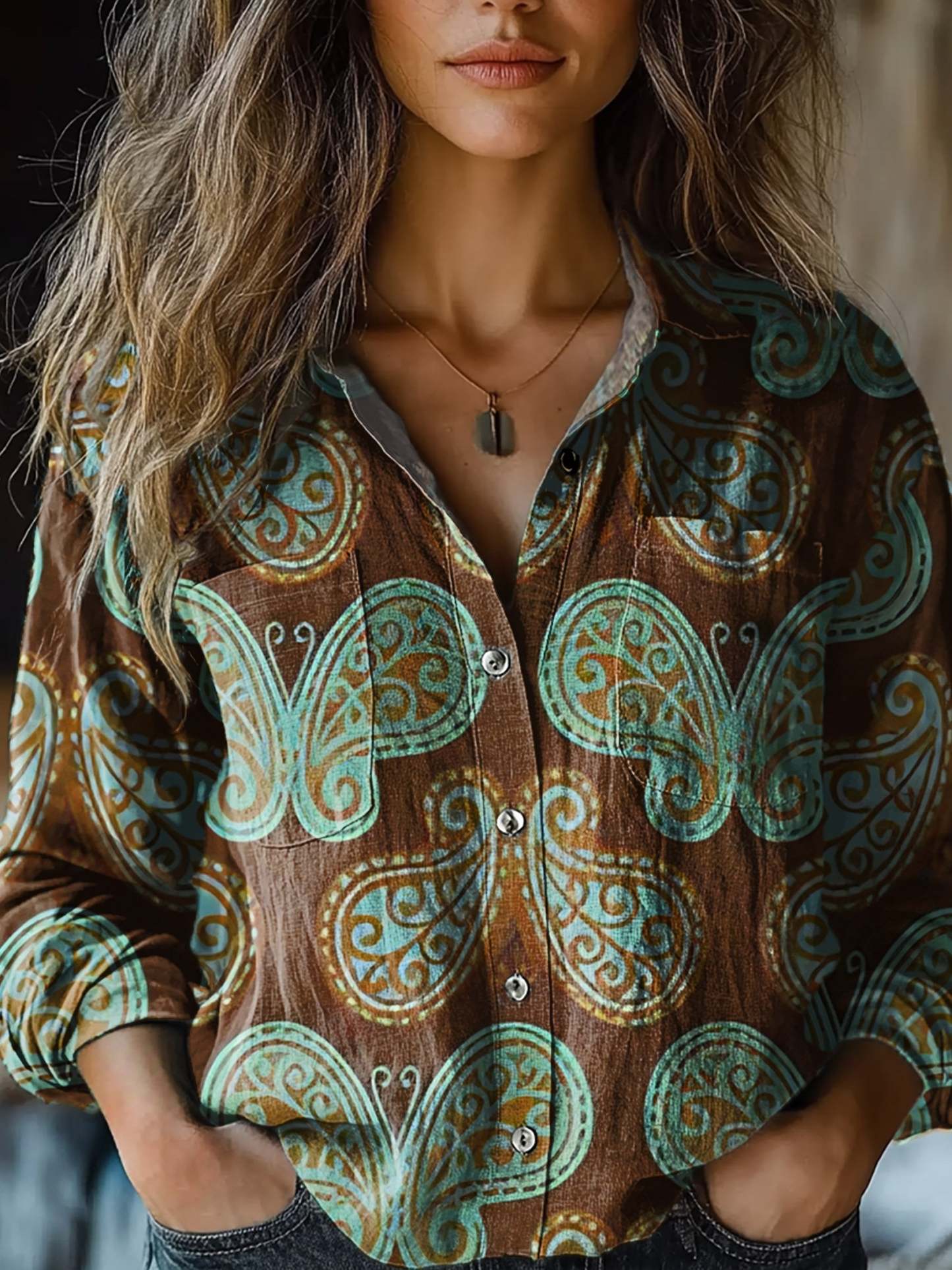 Women's Vintage Cashew Pattern Print Casual Long Sleeve Comfortable Cotton Shirt