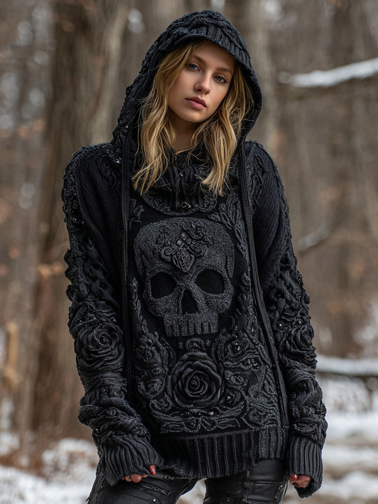 Women's Vintage Celtic Knot Skull And Roses Knitted Hooded Sweater