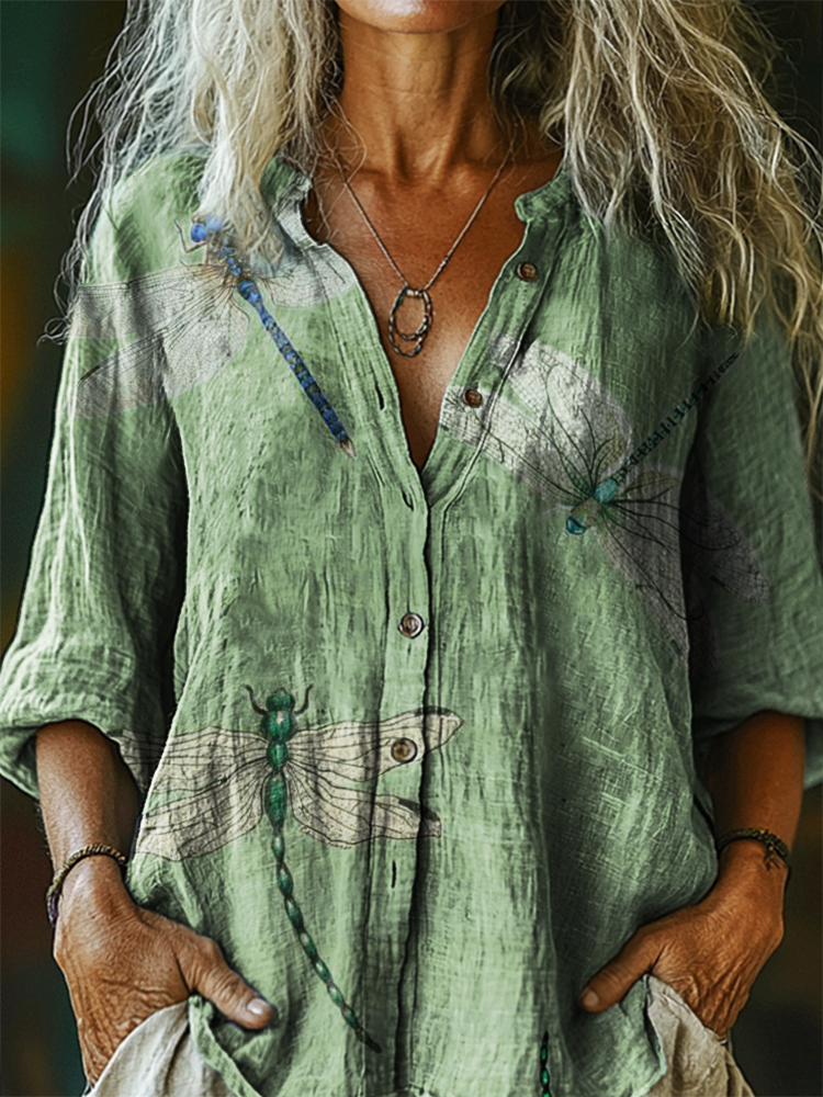 Women's Vintage Dragonfly Art Print Casual Cotton Linen Shirt