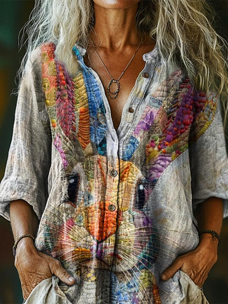 Women's Vintage Easter Bunny Art Print Casual Cotton Linen Shirt