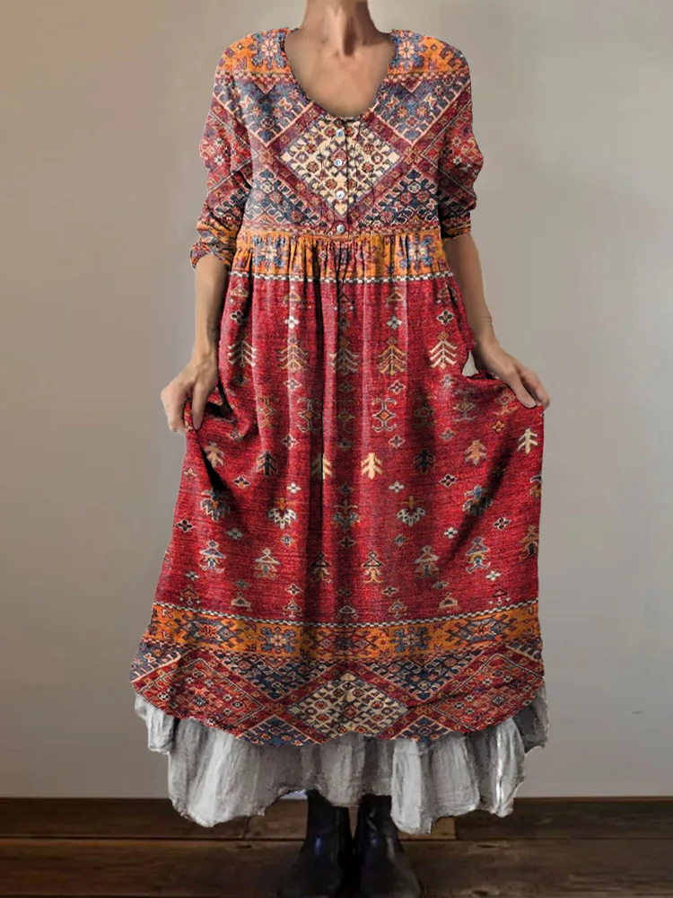 Women's Vintage Ethnic Art Patterns Print Button Pocket Cotton Dress