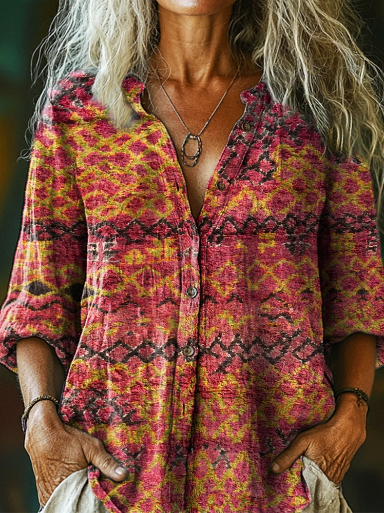Women's Vintage Ethnic Art Print Casual Cotton Linen Shirt