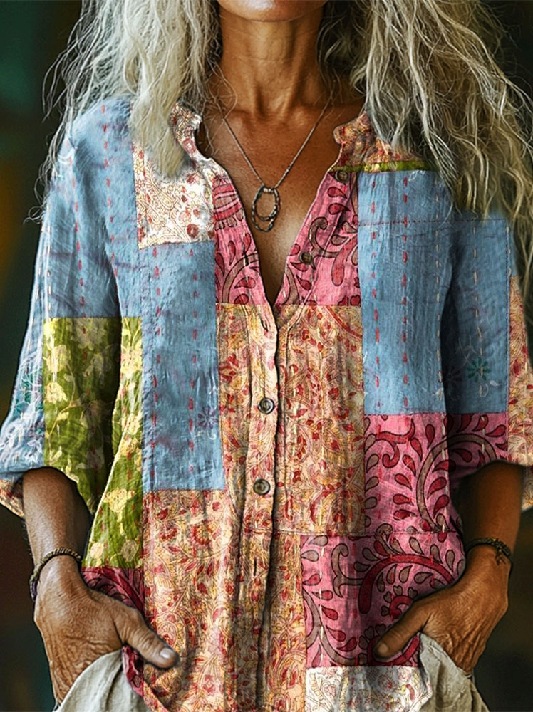Women's Vintage Ethnic Collage Art Pattern Print Casual Cotton Linen Shirt