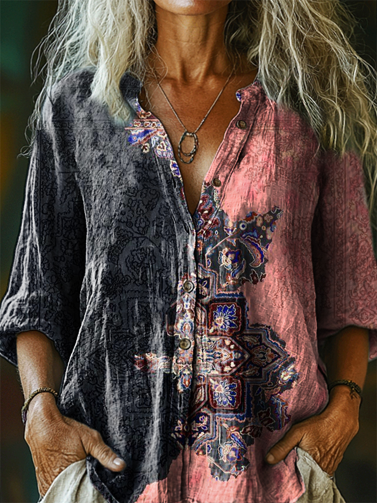 Women's Vintage Ethnic Floral Art Print Casual Cotton Linen Shirt