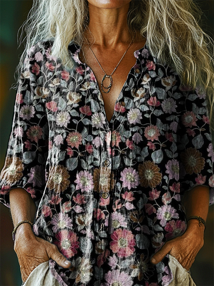 Women's Vintage Ethnic Floral Art Print Casual Cotton Linen Shirt