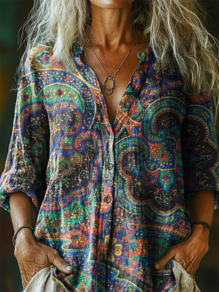 Women's Vintage Ethnic Floral Art Print Casual Cotton Linen Shirt