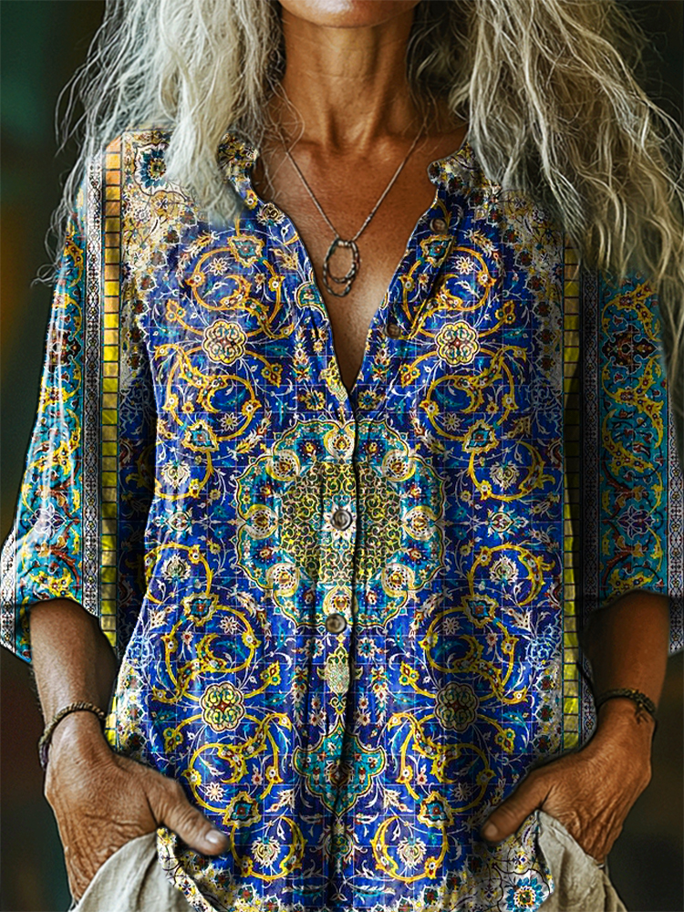 Women's Vintage Ethnic Floral Art Print Casual Cotton Linen Shirt