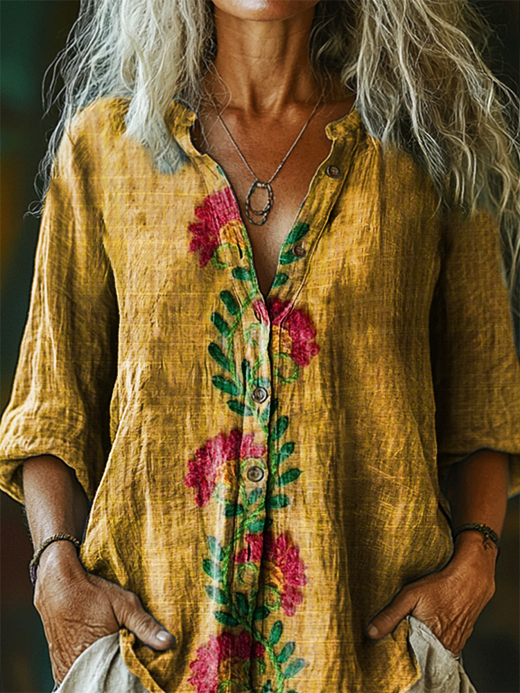 Women's Vintage Ethnic Floral Art Print Casual Cotton Linen Shirt
