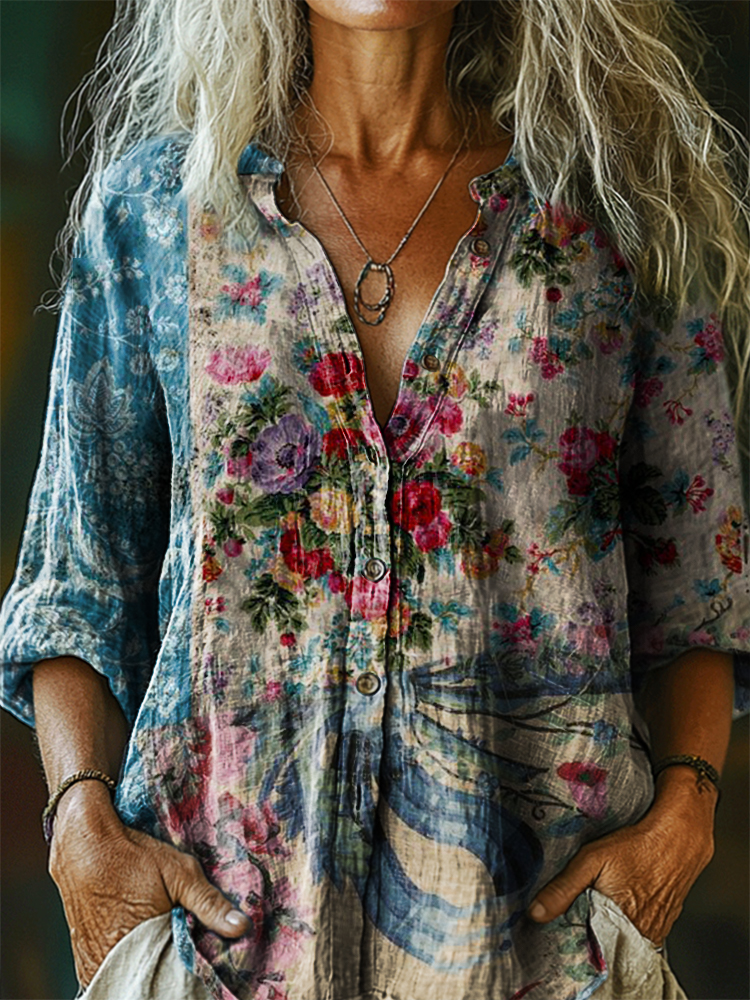 Women's Vintage Ethnic Floral Art Print Casual Cotton Linen Shirt