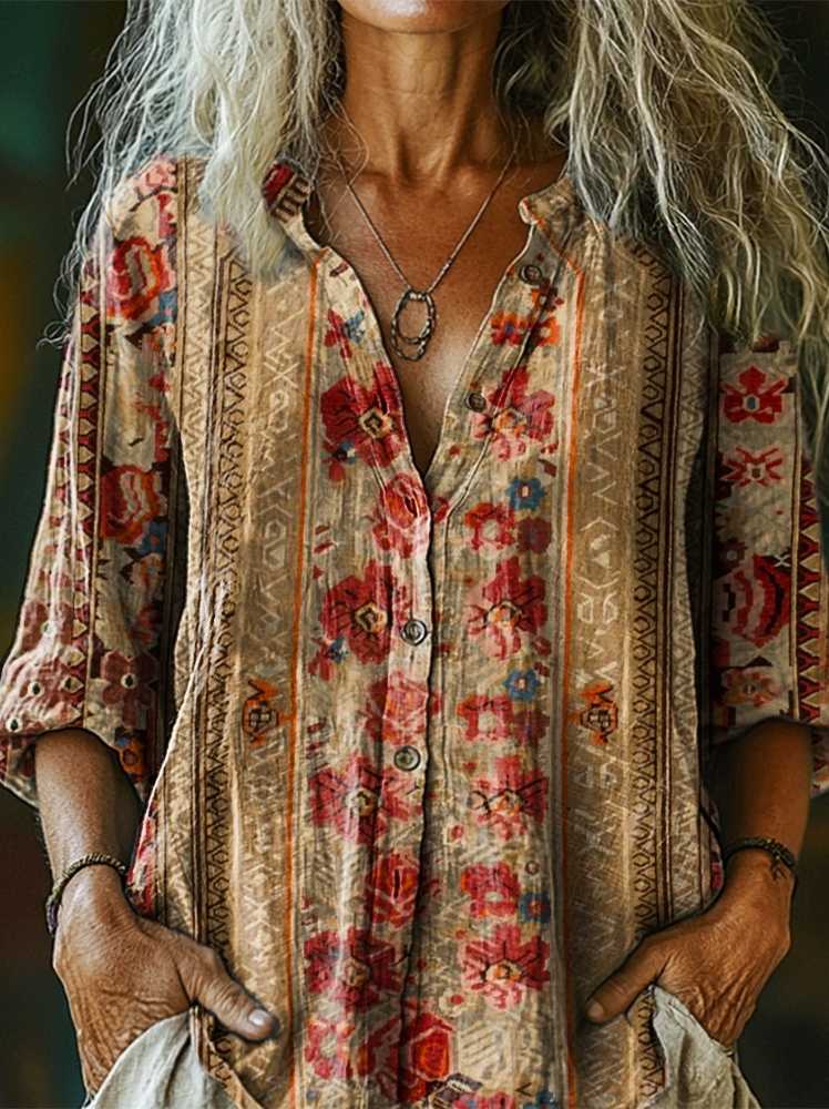 Women's Vintage Ethnic Floral Art Print Casual Cotton Linen Shirt