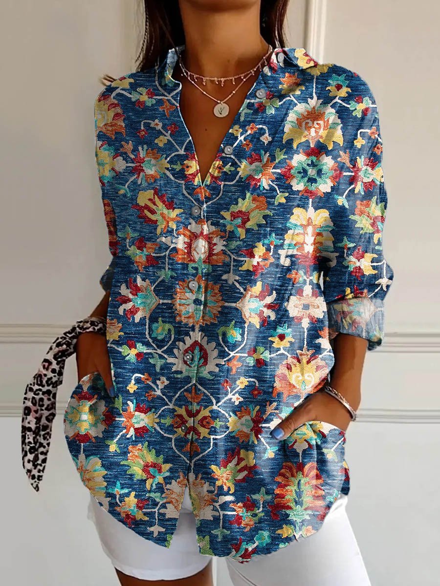 Women's Vintage Ethnic Floral Art Print Casual Cotton Shirt