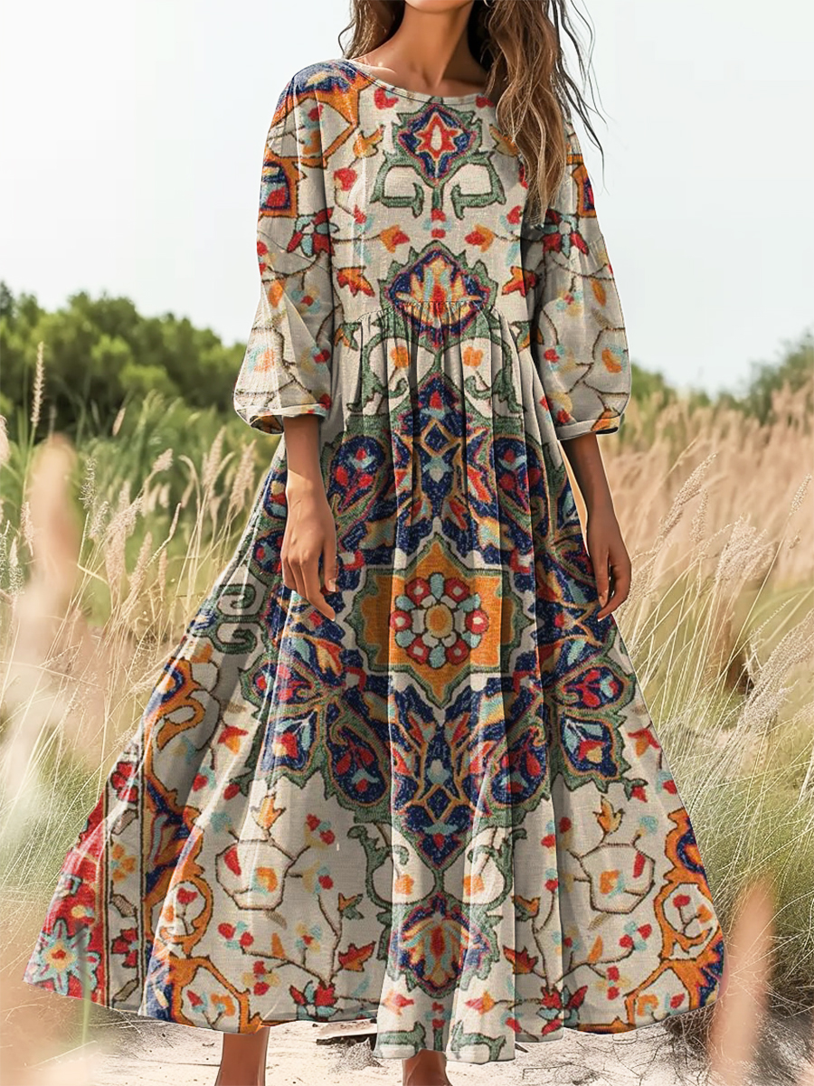 Women's Vintage Ethnic Floral Art Print Flowy Cotton Crew Neck Dress