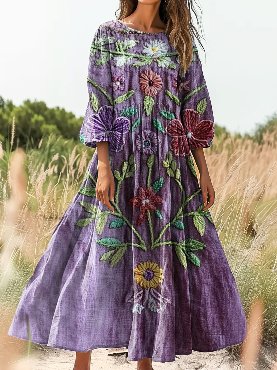 Women's Vintage Ethnic Floral Art Print Flowy Cotton Dress