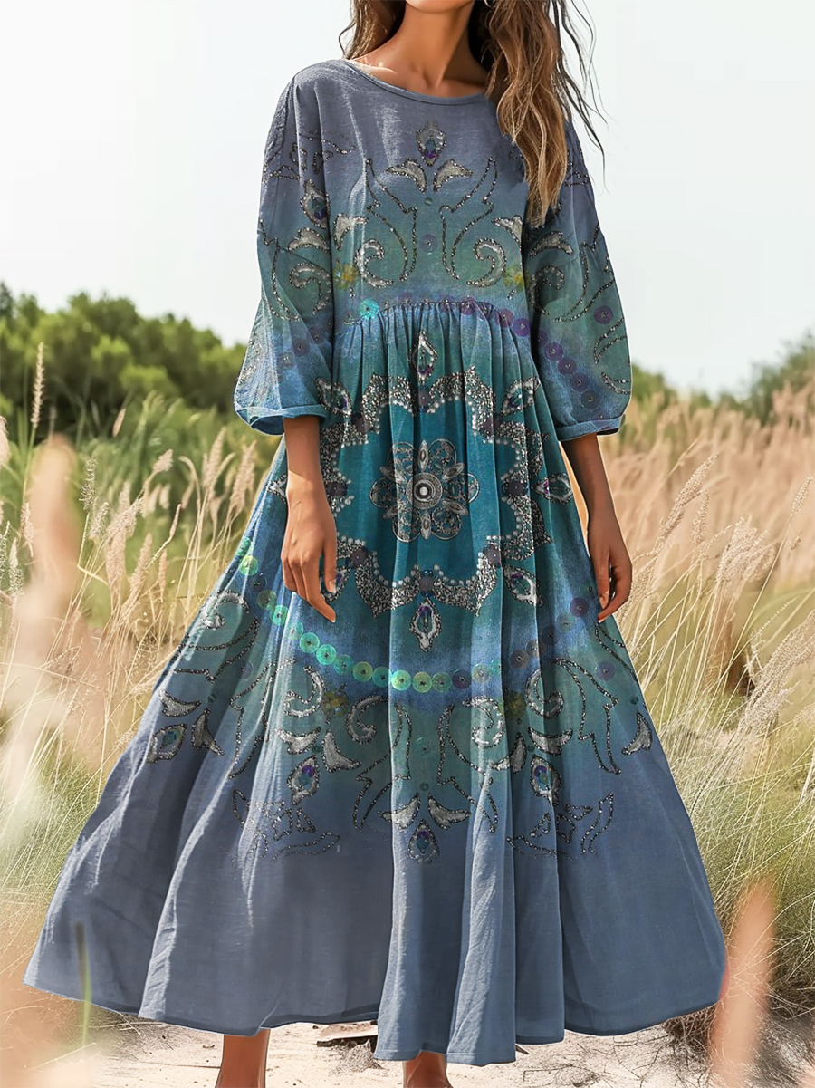 Women's Vintage Ethnic Floral Art Print Flowy Cotton Dress