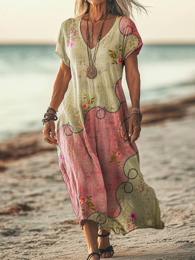 Women's Vintage Ethnic Floral Art Print Pocket Cotton Dress