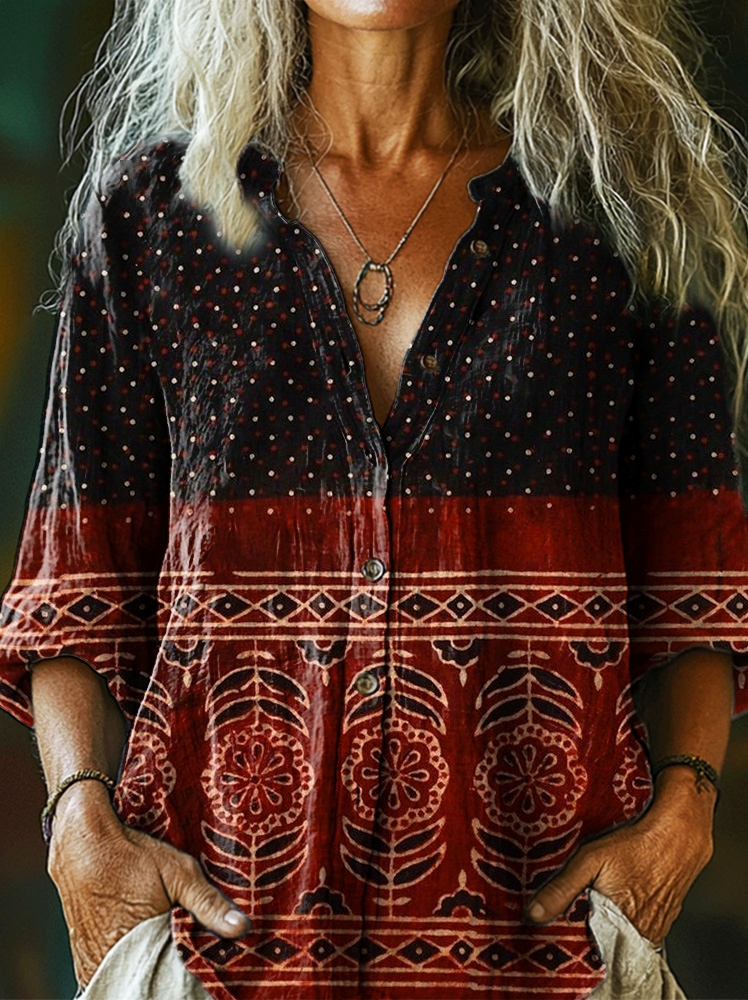 Women's Vintage Ethnic Floral Collage Art Print Casual Cotton Linen Shirt