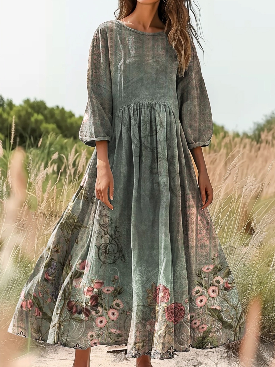 Women's Vintage Ethnic Floral Print Flowy Cotton Crew Neck Dress