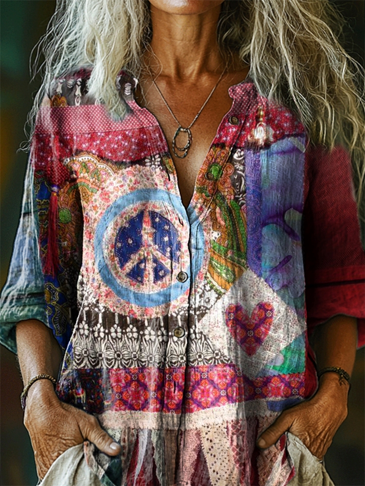 Women's Vintage Ethnic Patchwork Hippie Love Tattoo Pattern Art Print Linen Cotton Casual Shirt
