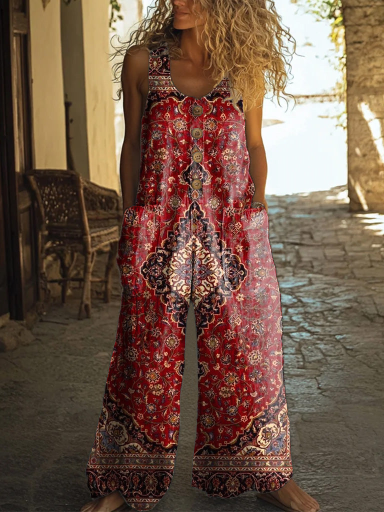 Women's Vintage Ethnic Style Tattoo Pattern Art Print Casual Suspenders Wide Leg Pants