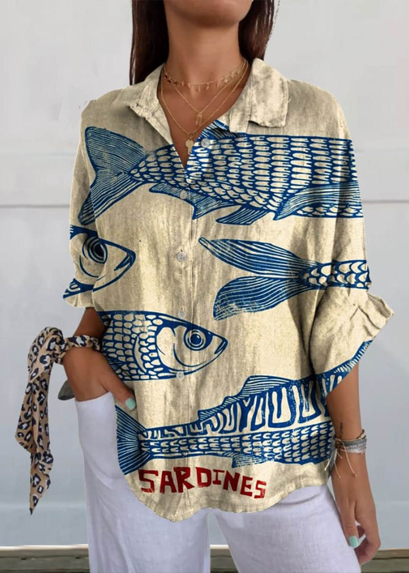 Women's Vintage Fish Sardines Art Print Casual Linen V-neck Shirt