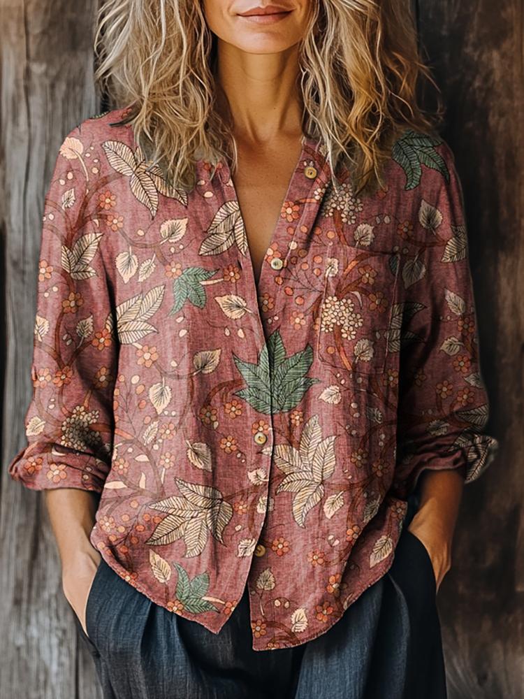 Women's Vintage Floral Art Print Casual Long Sleeve Cotton Shirt