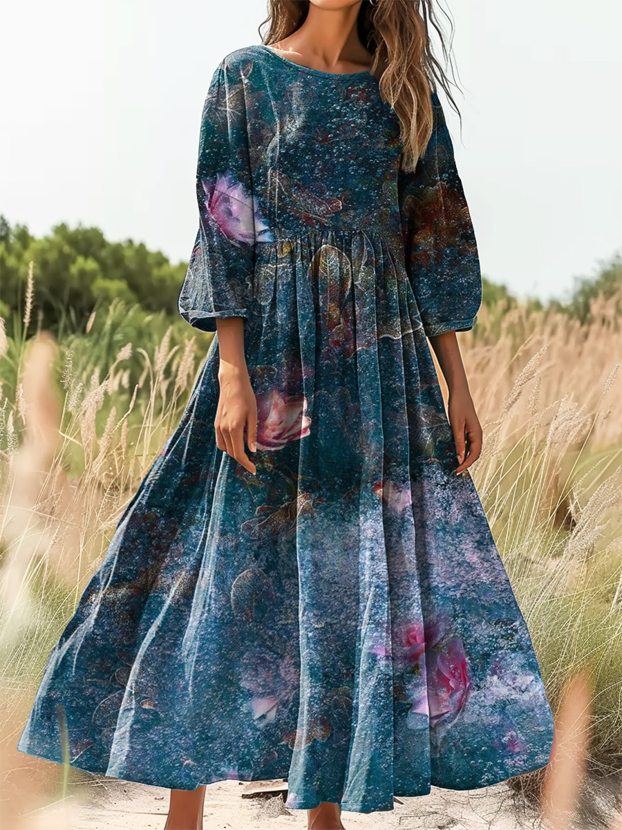 Women's Vintage Floral Art Print Flowy Cotton Crew Neck Dress