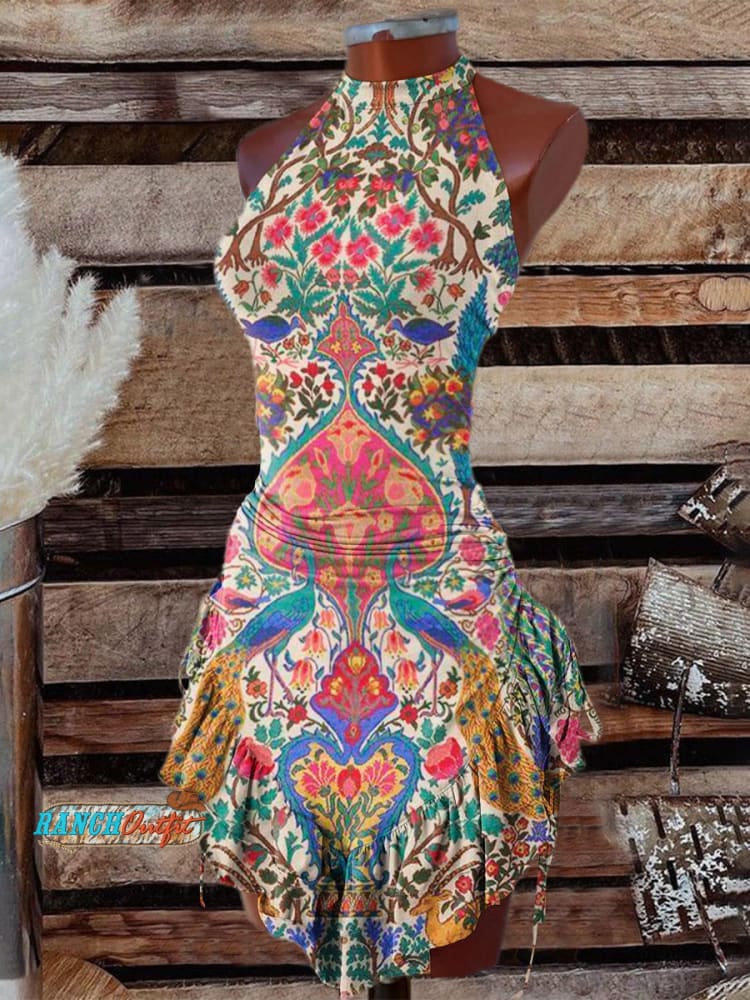 Women's Vintage Floral Art Print Halter Neck Dress