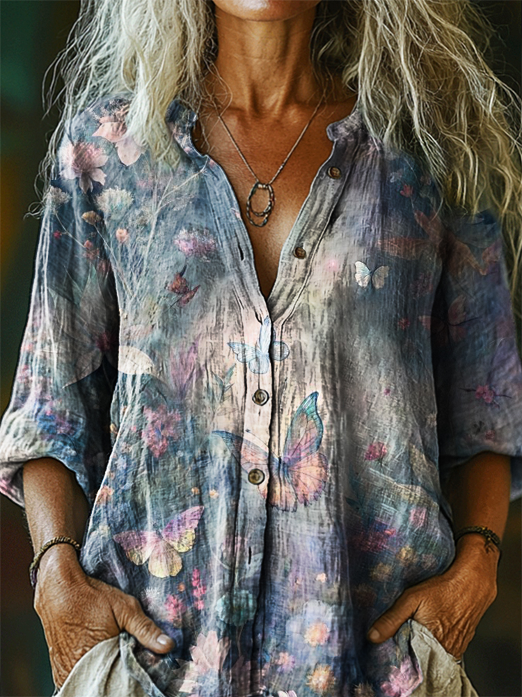 Women's Vintage Floral Butterfly Art Print Casual Cotton Linen Shirt