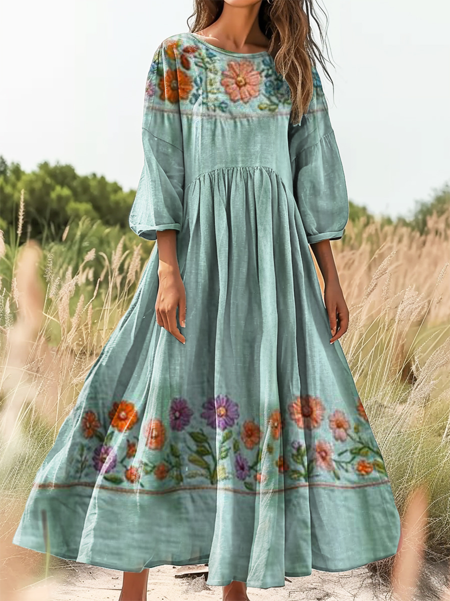 Women's Vintage Floral Collage Art Print Flowy Cotton Crew Neck Dress