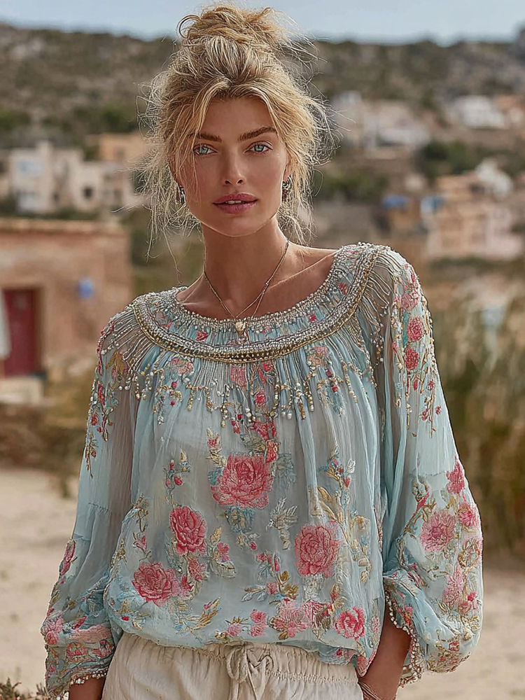Women's Vintage Floral Embroidered Linen Blend Crew Neck Shirt