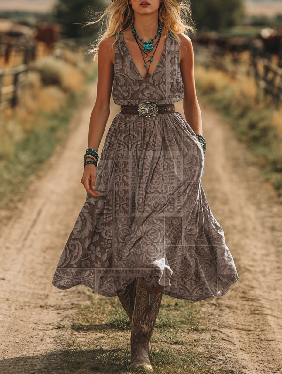 Women's Vintage Floral Print Sleeveless Cotton and Linen Pocket Dress