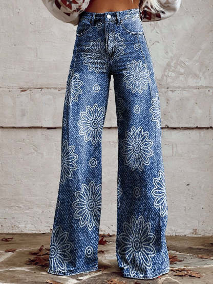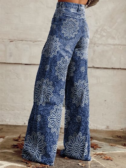 Women's Vintage Flower Print Casual Wide Leg Pants