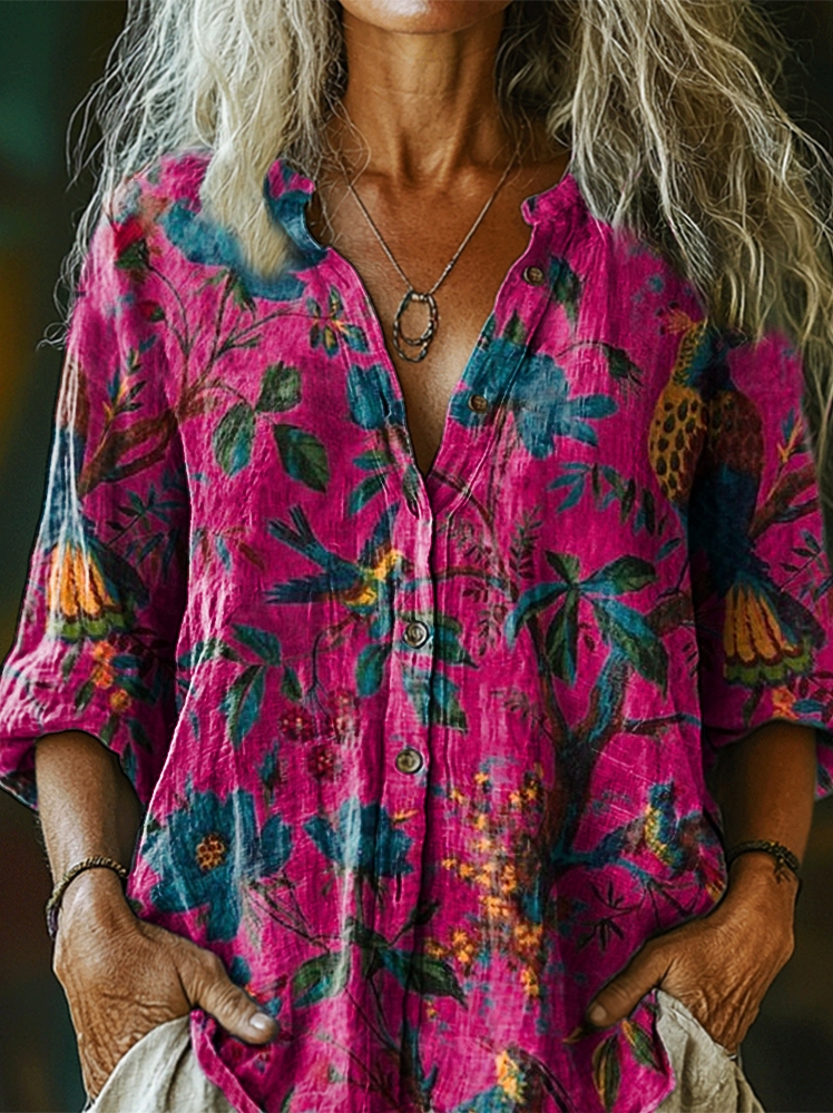 Women's Vintage Folk Floral Art Print Casual Cotton Linen Shirt
