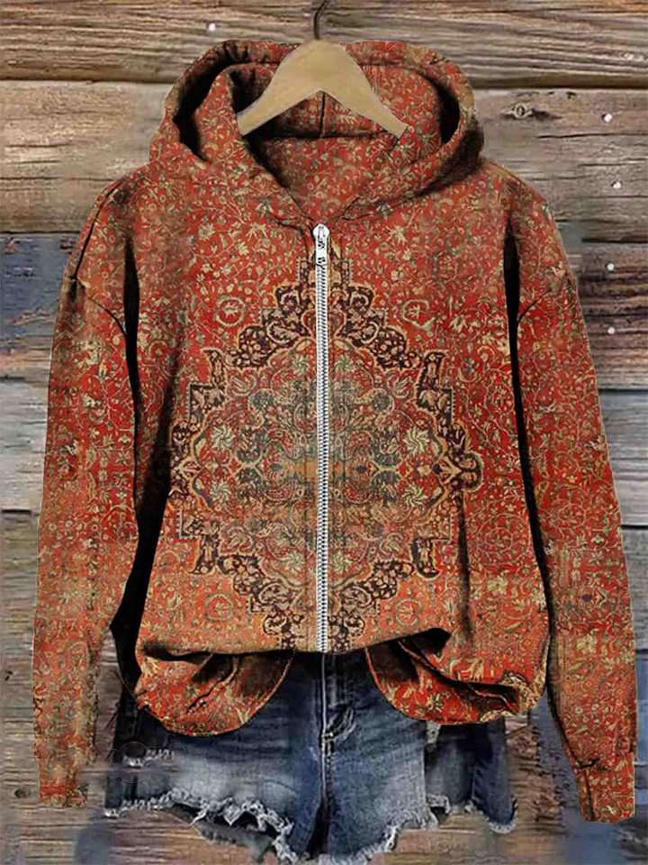 Women's Vintage Folk Floral Art Print Casual Zip Hoodie Sweatshirt