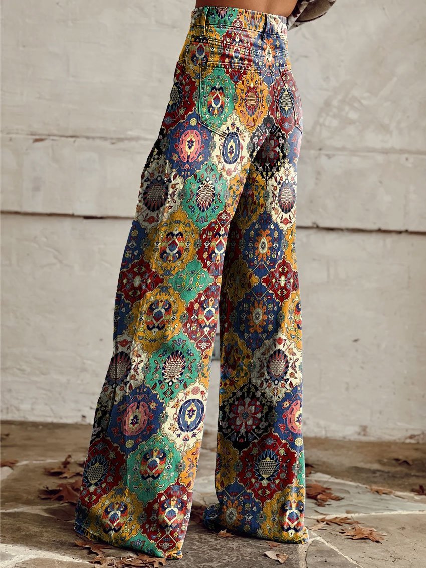 Women's Vintage Geometric Pattern Print Casual Wide Leg Pants