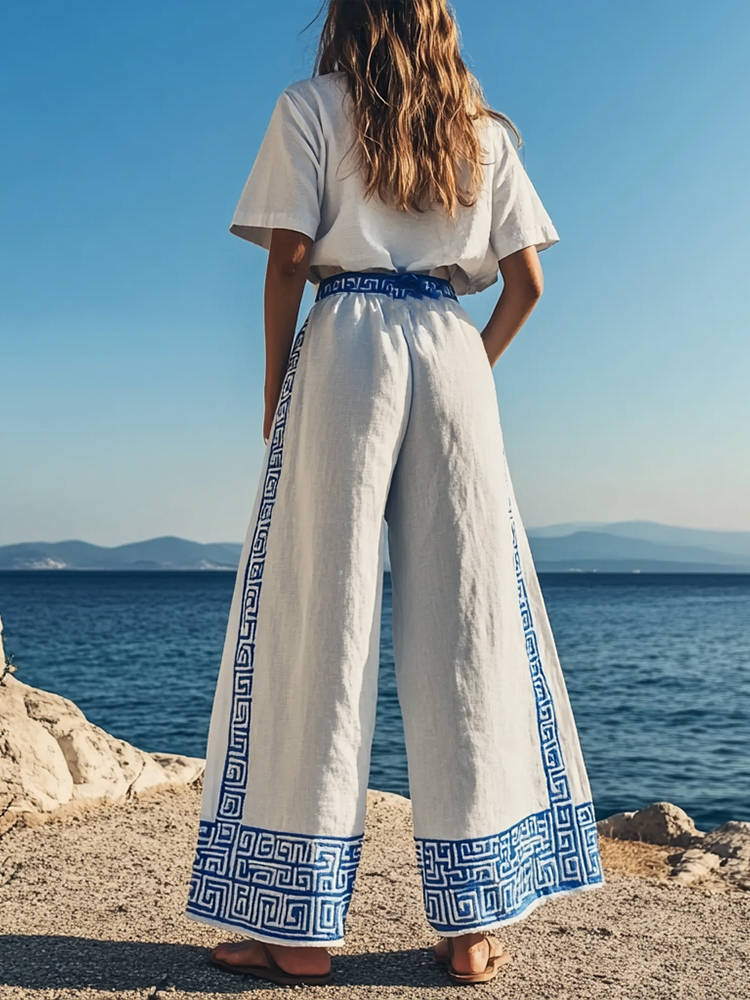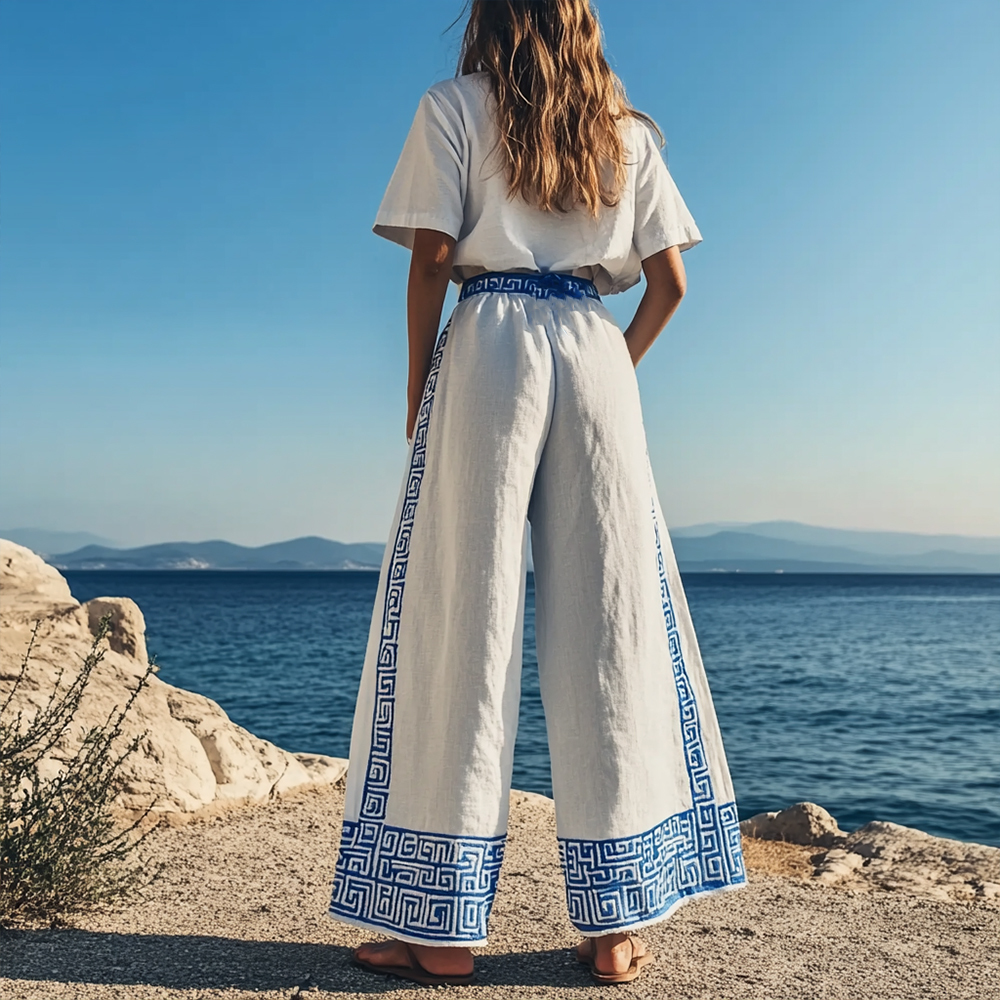Women's Vintage Greek Key Embroidered Linen Lounge Pants