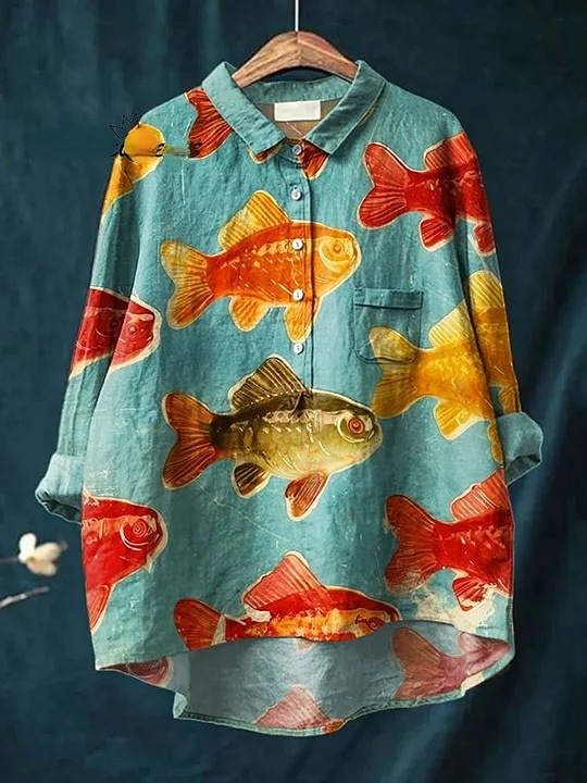 Women's Vintage Gummies Fish Art Print Casual Cotton And Linen Shirt