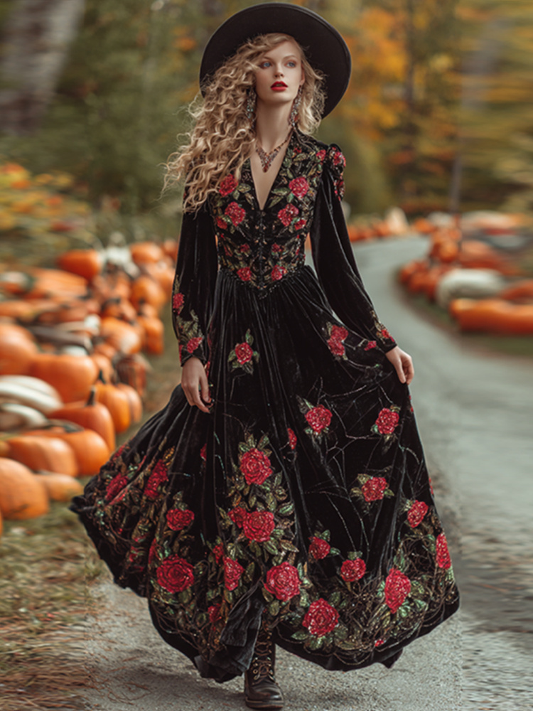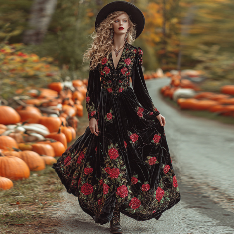 Women's Vintage Halloween Rose Art Comfy Velvet Maxi Dress