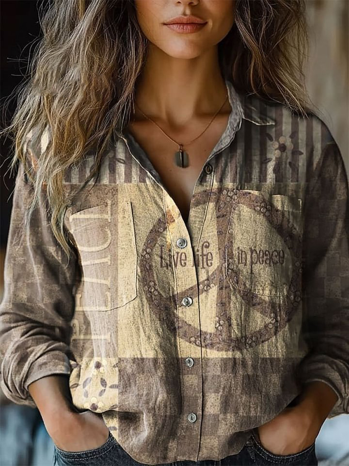 Women's Vintage Love and Peace Art Print Casual Long Sleeve Comfortable Cotton Shirt