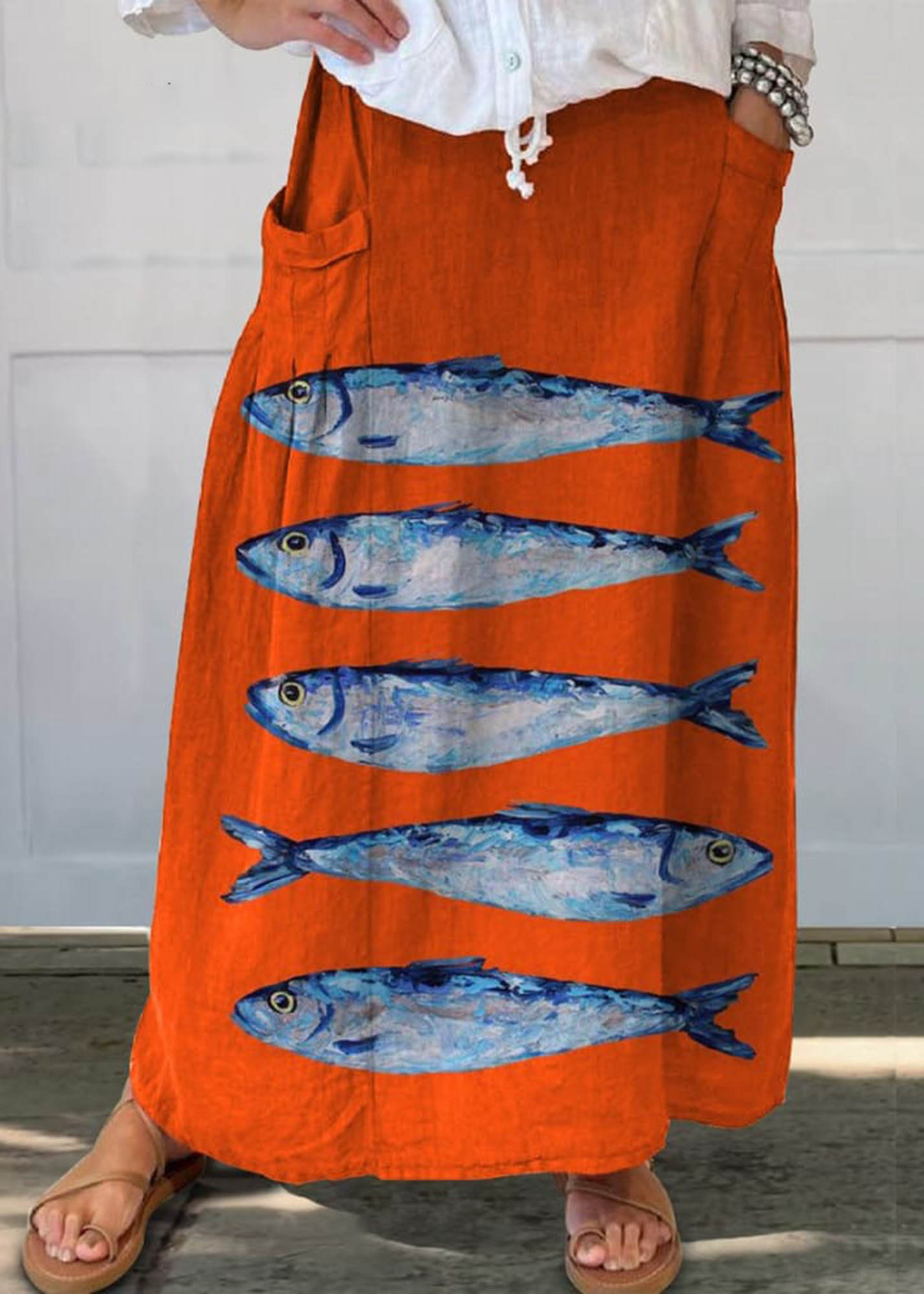 Women's Vintage Lovely Fish Art Print Linen Pocket Skirt