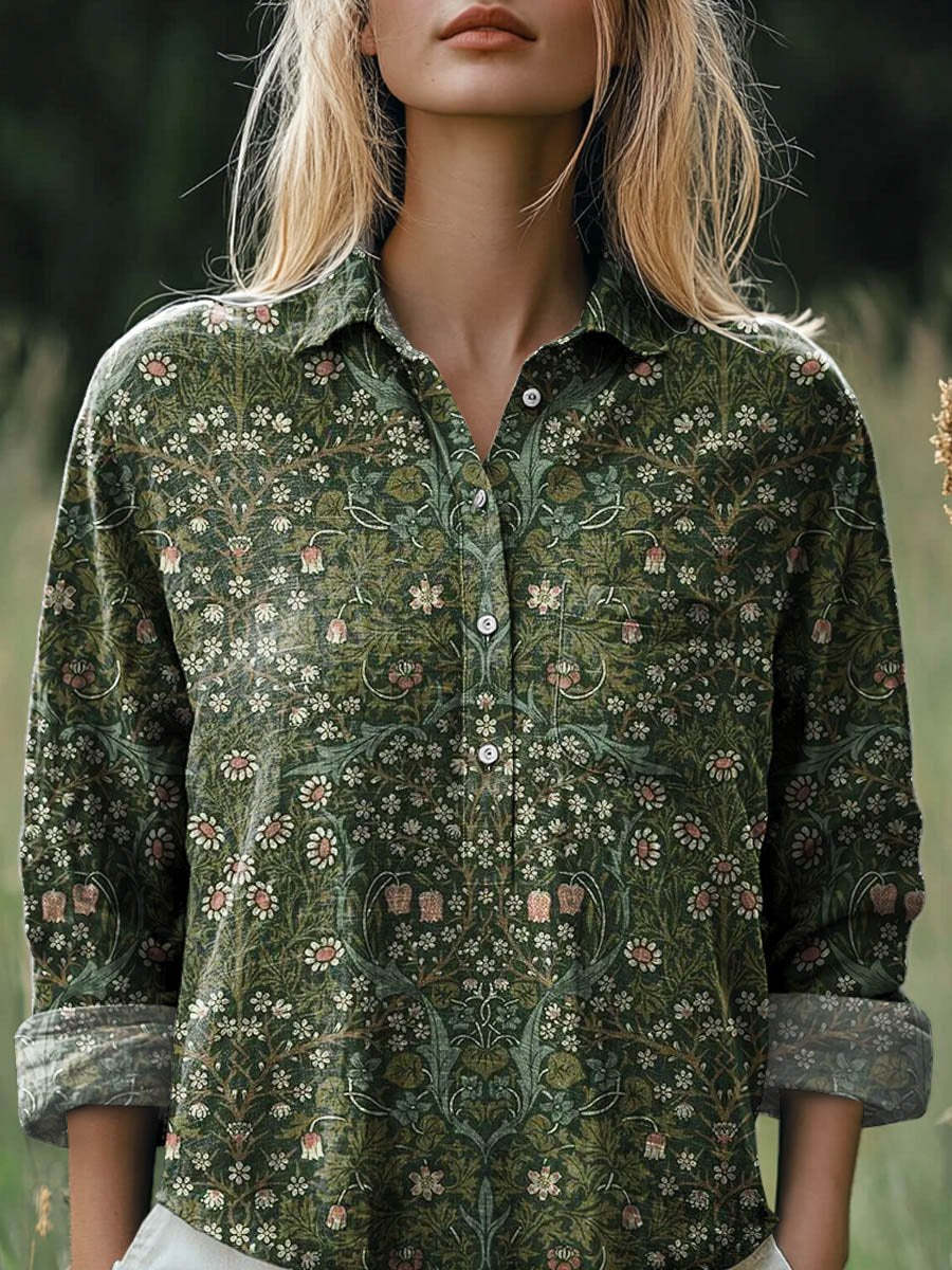 Women's Vintage Lovely Floral Art Print Casual Cotton And Linen Shirt