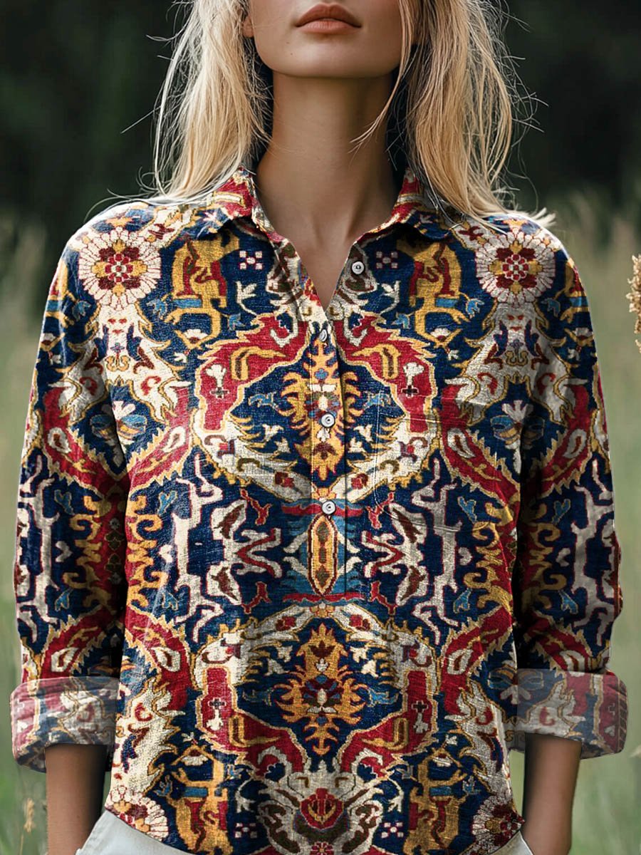 Women's Vintage Lovely Floral Art Print Casual Cotton And Linen Shirt