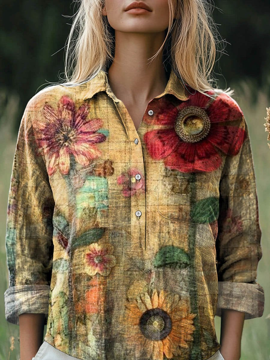 Women's Vintage Lovely Floral Art Print Casual Cotton And Linen Shirt
