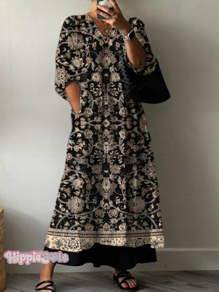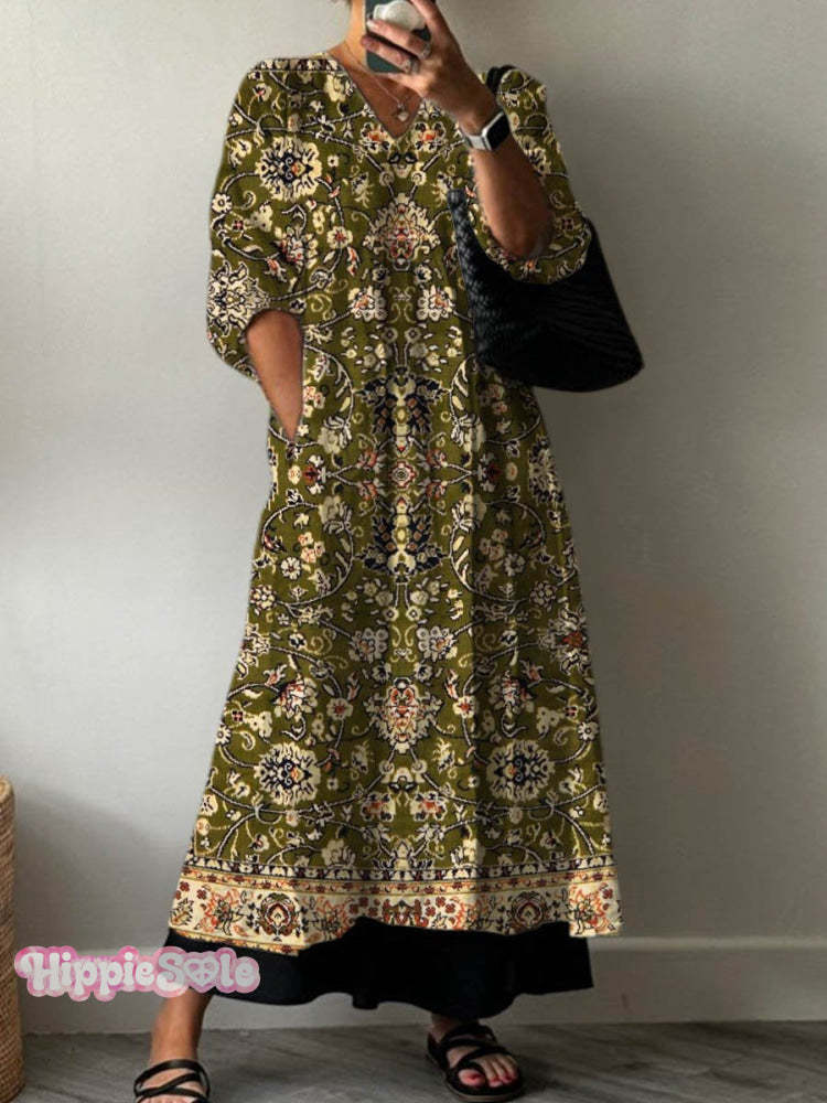 Women's Vintage Lovely Floral Art Print Pocket V-neck Cotton Dress